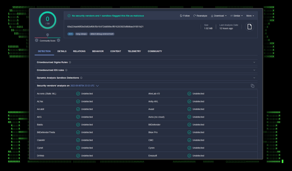 As you can see from the figure below, the help file would have no trouble evading antivirus and EDR detections as it scored 0/59 detections in VirusTotal.