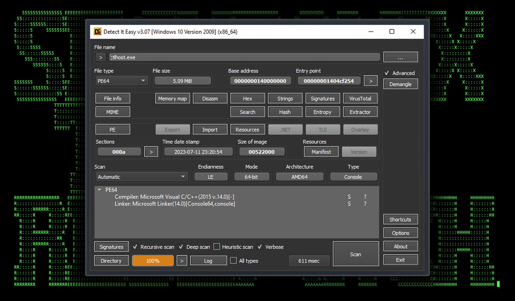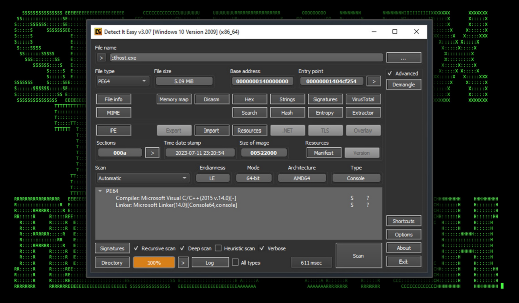 The Windows binary file downloaded is a 64-bit executable at about 5MB in size. Some additional binary information is highlighted in figure 10 below.