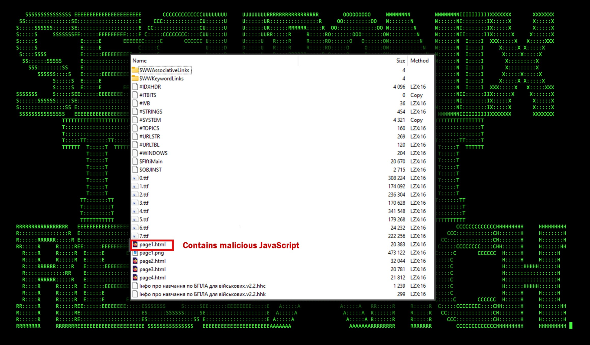 Since Microsoft help files are essentially container files, they can be opened and analyzed using file archival software such as 7zip. With the case of Інфо про навчання по БПЛА для військових.v2.2.chm, we’re able to observe several HTML files contained within.