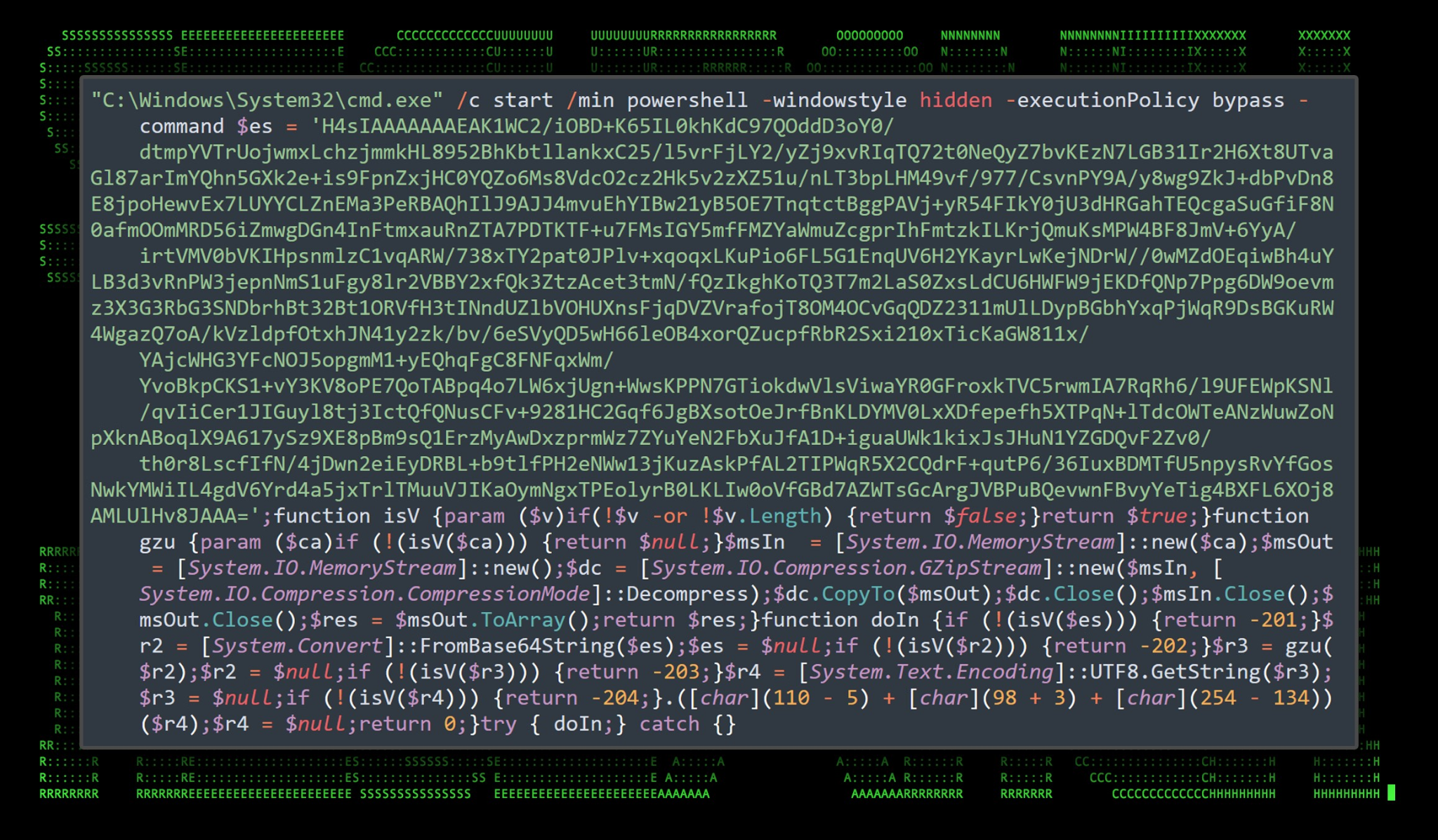 The .chm file executes cmd.exe along with the “/c start /min” commands to call the PowerShell process which executes inside a hidden window. The PowerShell code is heavily obfuscated in order to evade detections. Some obfuscation methods include Base64 encoding, GZIP compression, and char value substitutions.