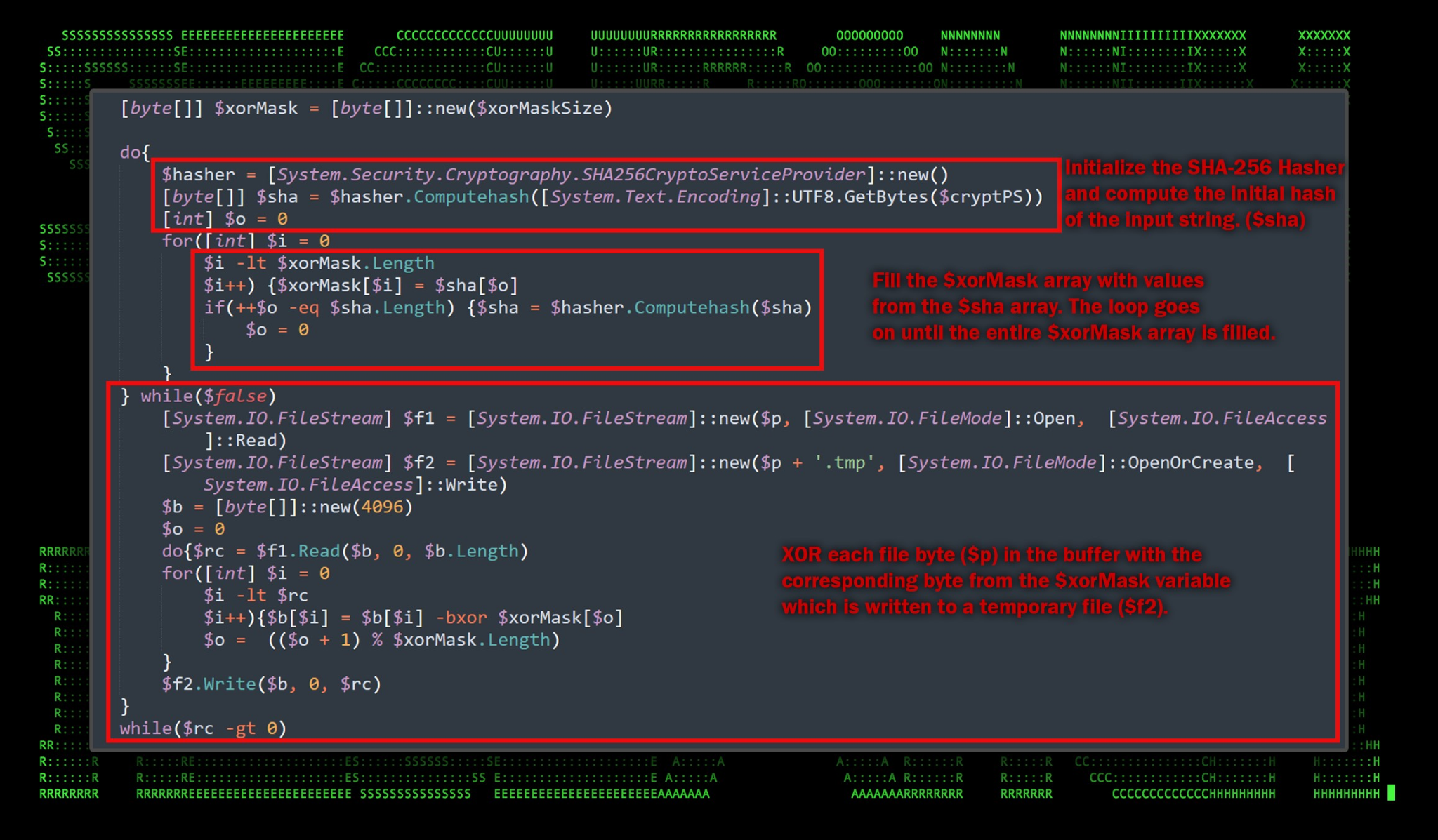 Further down the script we find some interesting binary file manipulation code blocks which can be seen in figure 8 below: