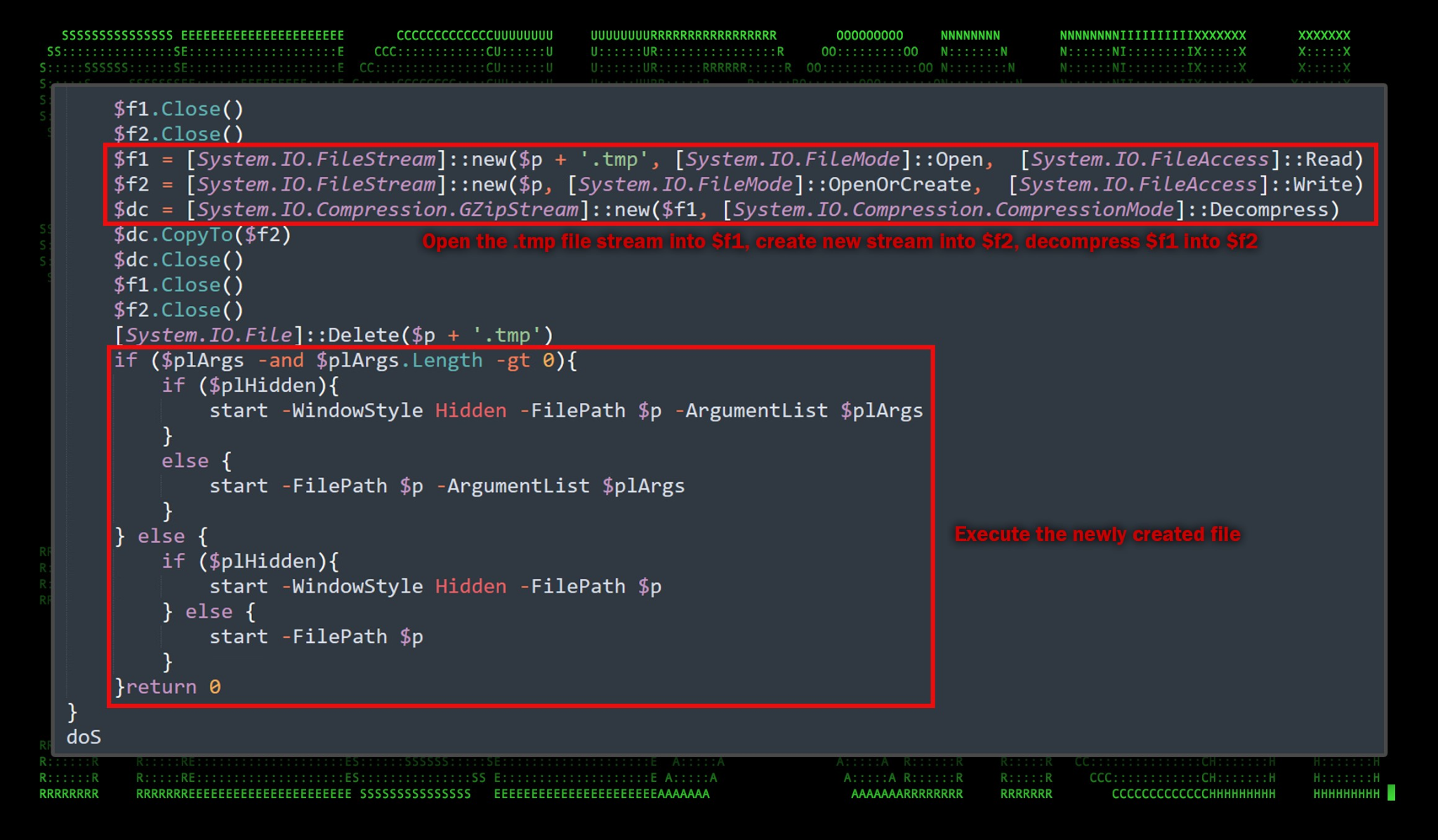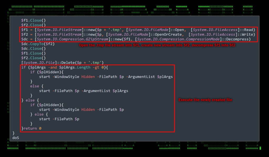 The last bit of code takes a previously downloaded, encrypted and compressed file with a .tmp extension, decompresses its content, writes the decompressed content back to the original file, deletes the .tmp file. The last portion of the script then executes the original file in a few different ways.